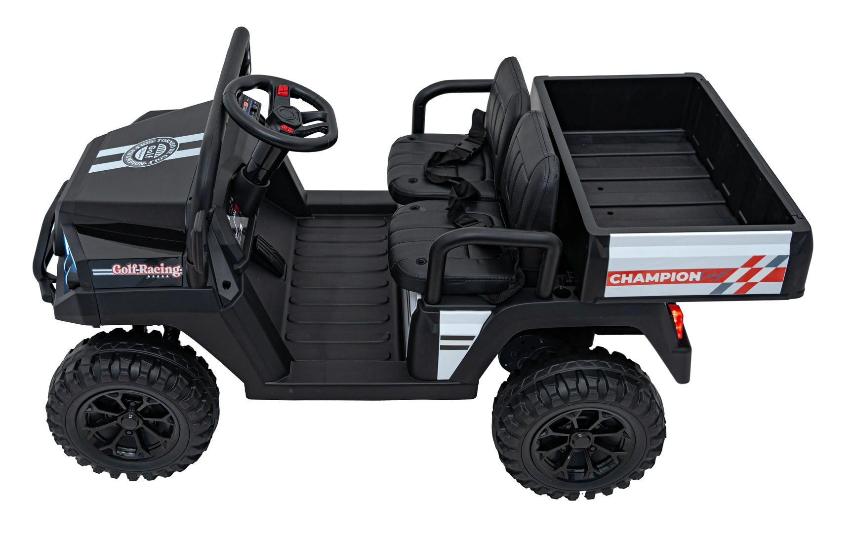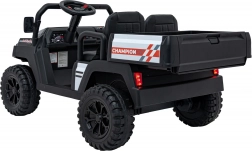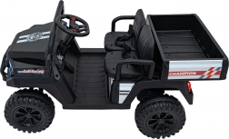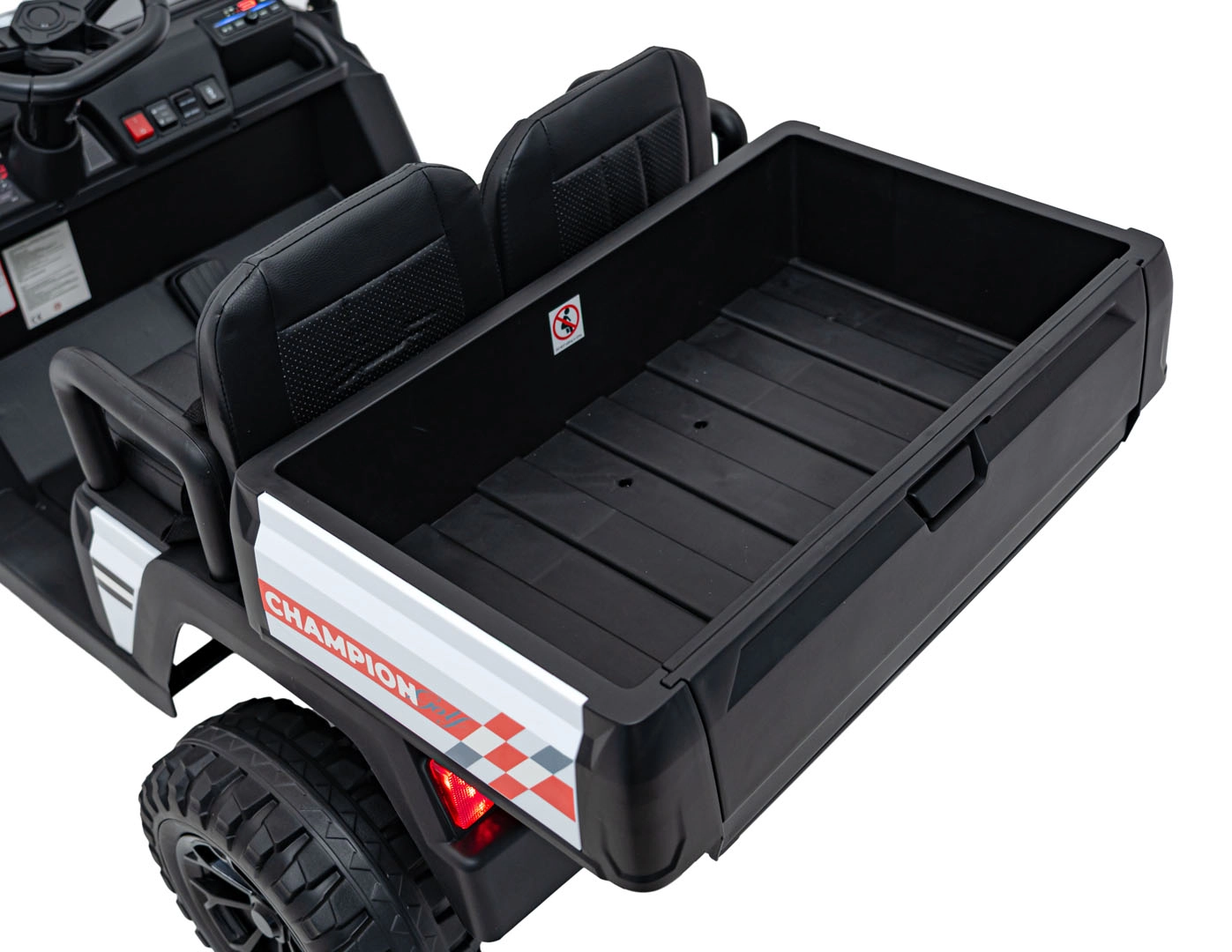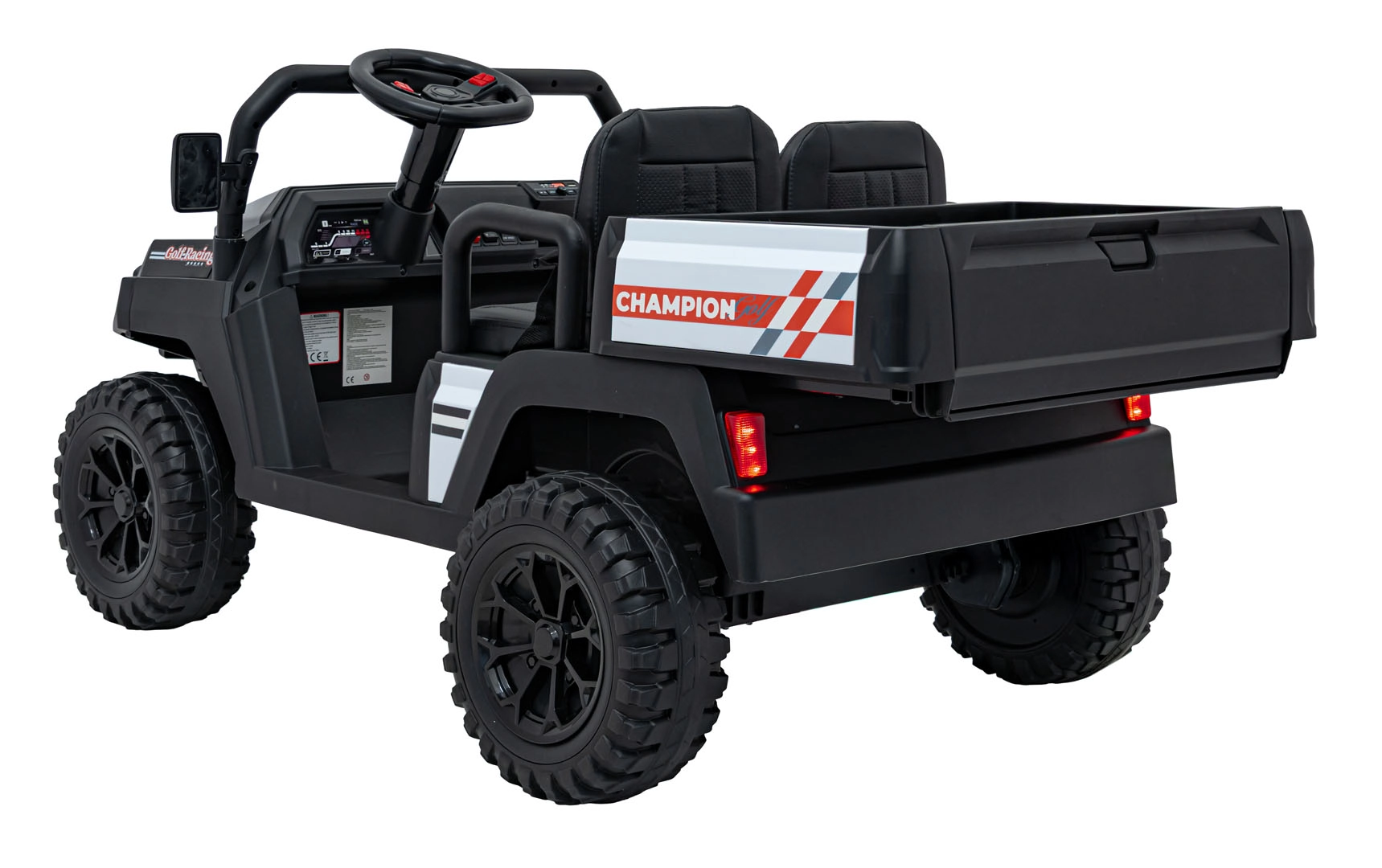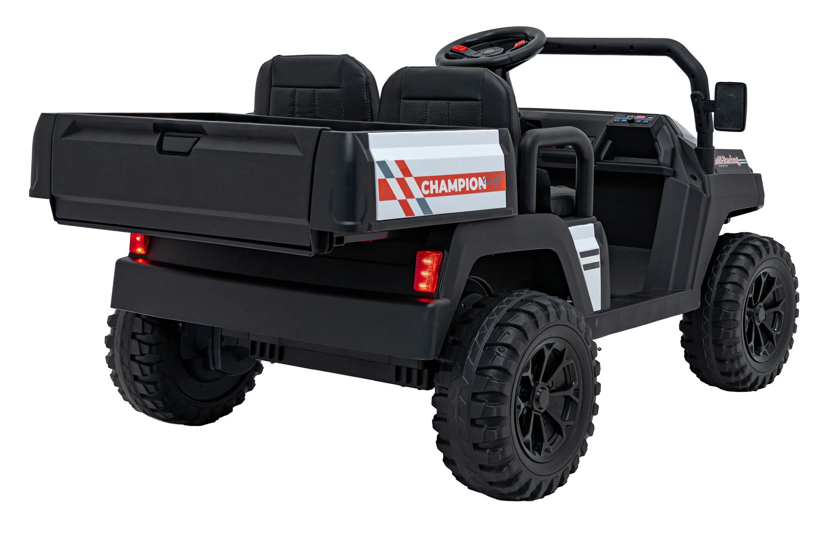 Der leistungsstarke elektrische Pick-up CHAMPION in markantem Schwarz ist für Abenteuer gebaut. Zwei 200-W-Motoren (insgesamt 400 W) in Kombination mit einem 24V 9Ah Akku liefern Kraft auch für leichtes Gelände, während EVA-Schaumräder und die vollständige Federung vorne und hinten Komfort und Stabilität gewährleisten. Sanftes Anfahren, 2 Vorwärtsgeschwindigkeiten und Rückwärtsgang erleichtern die Bedienung für Einsteiger.