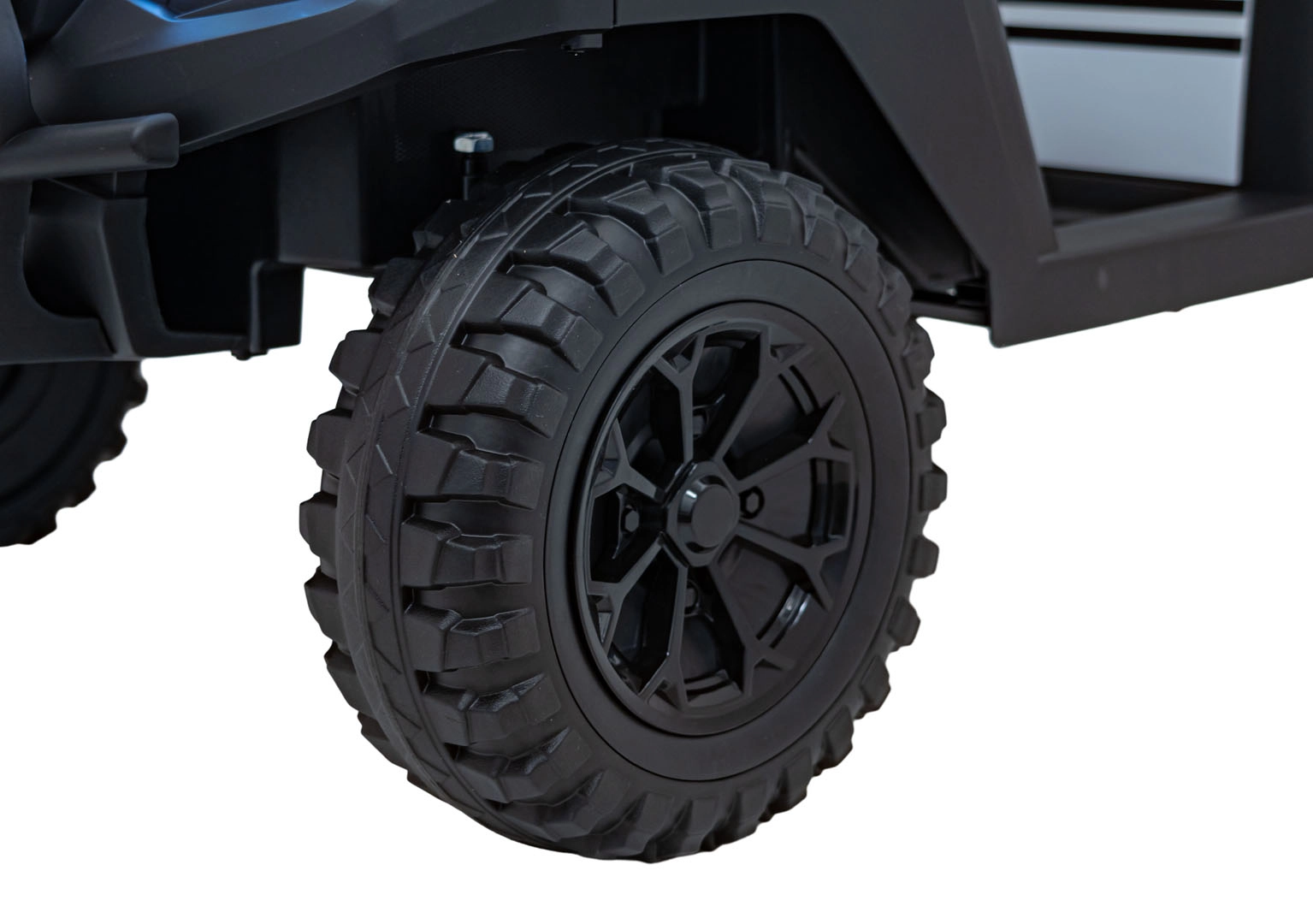 Zwei 200-W-Motoren liefern Kraft fürs Gelände, der 24V 9Ah Akku sorgt für lange Fahrten und der sanfte Anfahrmodus erleichtert die Bedienung auch für die kleinsten Fahrer.