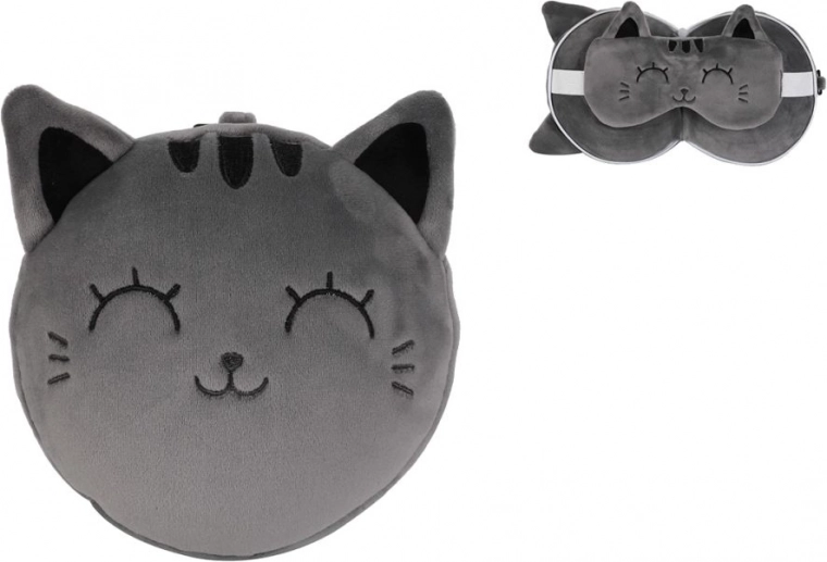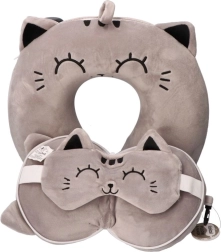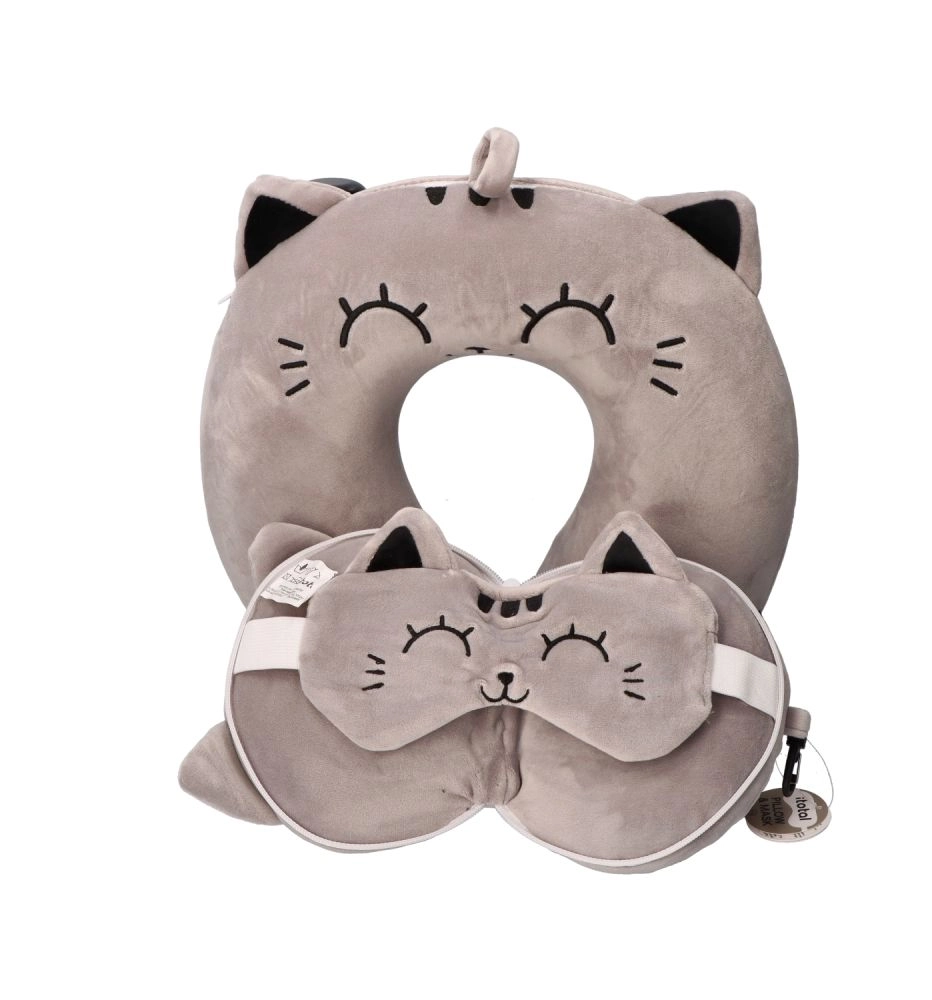 Genießen Sie erholsamen Schlaf auf Reisen dank des weichen Reisekissens mit niedlicher Maske in Form einer grauen Katze. Die ergonomische Form hilft, die Halswirbelsäule zu entlasten, und die Schlafmaske blockiert effektiv Licht für ungestörte Erholung.