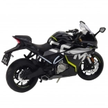 Das Sportmotorradmodell in elegantem Schwarz imitiert eine echte Rennmaschine. Dank Metallteilen und präzise ausgearbeiteten Details ist es ideal als Deko auf dem Regal sowie als robustes Spielzeug für den täglichen Gebrauch. Integrierte Licht- und Soundeffekte verstärken das realistische Erlebnis.