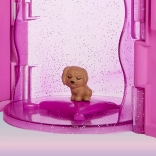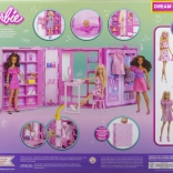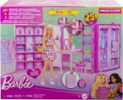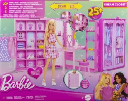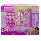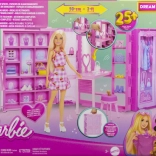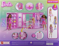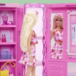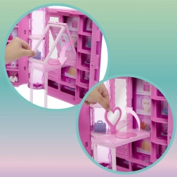 Beim Öffnen entfaltet sich eine Spielwelt mit einer Breite von über 90 cm, mit mehr als 20 Fächern, 2 ausziehbaren Stangen für Kleiderbügel und einem Schuhregal. Lass Barbie ein Outfit vom Kleiderständer wählen, Accessoires vor dem Spiegel abstimmen und sich am Frisiertisch vorbereiten – dann kann sie zusammen mit dem Hündchen zu neuen Abenteuern aufbrechen. Aufräumen ist kinderleicht: Alle Teile passen zurück in den Schrank mit pinkem Tragegriff.