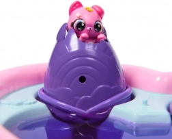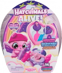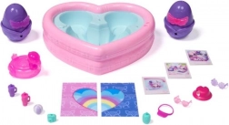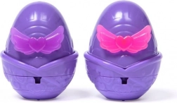 Tauche die Eier in den Herz-Pool, nimm die Flügelchen ab und gieße langsam Wasser ein – sobald beide Hälften des Herzens die Farbe wechseln, schlüpfen deine Hatchimals. Mit mehr Wasser verbinden sich die Farben zu Lila und erzeugen einen auffälligen Neon-Look. Das magische Schlüpfen im Wasser mit Farbwechsel macht jedes Spiel zu einem einzigartigen Erlebnis.