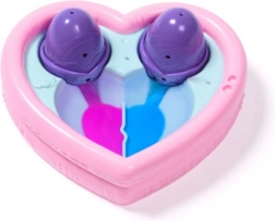 Lege die Eier in den Herz-Pool, entferne die Flügelchen und gieße langsam Wasser ein. Sobald beide Seiten des Herzens die Farbe wechseln, schlüpfen die Figuren. Mit mehr Wasser mischen sich die Farben zu Lila – für einen noch stärkeren Wow-Effekt.