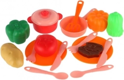 Teller, Besteck, Töpfe, Pfannen und Kunststoff-Lebensmittel – Kinder können unbegrenzt servieren und „kochen“.