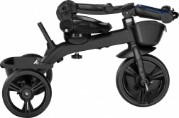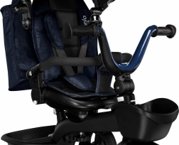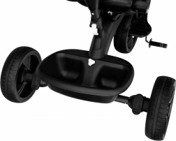 Der monolithische Magnesiumrahmen ist deutlich leichter als Stahl oder Aluminium, dabei stabil und dämpft Vibrationen auf natürliche Weise. Für Sicherheit sorgen 3-Punkt-Gurt, weicher Sicherheitsbügel, rutschfeste Griffe, die Möglichkeit zur Radblockierung im Stand sowie die Konformität mit EN 71. Die praktische Ausstattung umfasst Flaschenhalter, zwei geräumige Körbe und eine verschließbare Tasche für Kleinigkeiten.