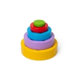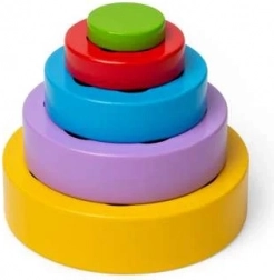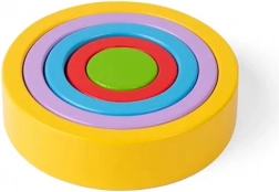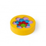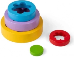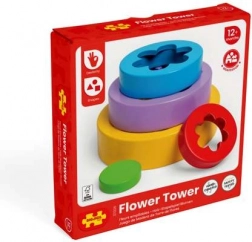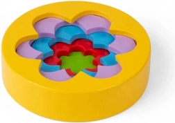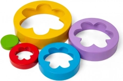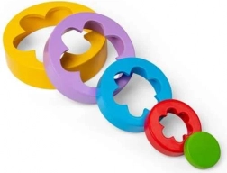 Fünf Teile in unterschiedlichen Größen ermöglichen das Bauen eines Turms oder das Gestalten farbenfroher Blumenmuster. Kinder lernen spielerisch Farben kennen und Größen zu unterscheiden.