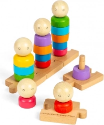 Dieses hölzerne Steckset ermöglicht Kindern freudiges Entdecken durch Spiel. Fünf einzelne Stäbe auf einer Puzzle-Basis erlauben das Bauen verschiedenster Figuren aus farbigen Ringen und Köpfen mit Gesichtern. Dank austauschbarer Teile können Kinder Formen, Farben und Reihenfolgen erkunden und zugleich Geduld sowie logisches Denken trainieren.