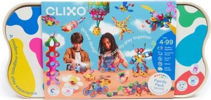 CLIXO Family Party ist ein großes Set für die ganze Familie und für Gruppenspiele. Dank des patentierten Magnetsystems mit 360°-Drehbewegung und Arretierung in 24 Positionen bleiben Ihre Kreationen fest und stabil. Aus den flexiblen, multidirektionalen Teilen bauen Sie mühelos 2D- und 3D-Modelle – von Tieren und Fahrzeugen bis hin zu Architektur und wissenschaftlichen Projekten.