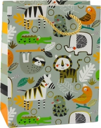 Diese Papiertasche mit Safari-Tiermotiven verleiht Ihren Geschenken Charme. Jede Tasche hat ein robustes und farbenfrohes Design, das jeden anspricht. Solide Griffe bieten bequeme Handhabung, während die ansprechenden Muster voller glücklicher Tiere sowohl Kinder als auch Erwachsene begeistern.