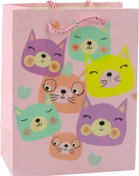 Geschenktasche mit niedlichen Katzenmotiven in Pastellfarben und Brokat-Elementen.