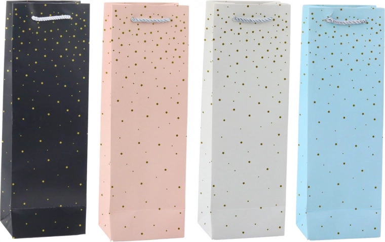 Elegante Papiertasche für Flaschen ist die perfekte Möglichkeit, Getränke für verschiedene Anlässe zu verpacken. Hergestellt aus hochwertigem Papier und gekennzeichnet durch ein subtiles Muster aus goldenen Punkten, die Eleganz und Stil verleihen.