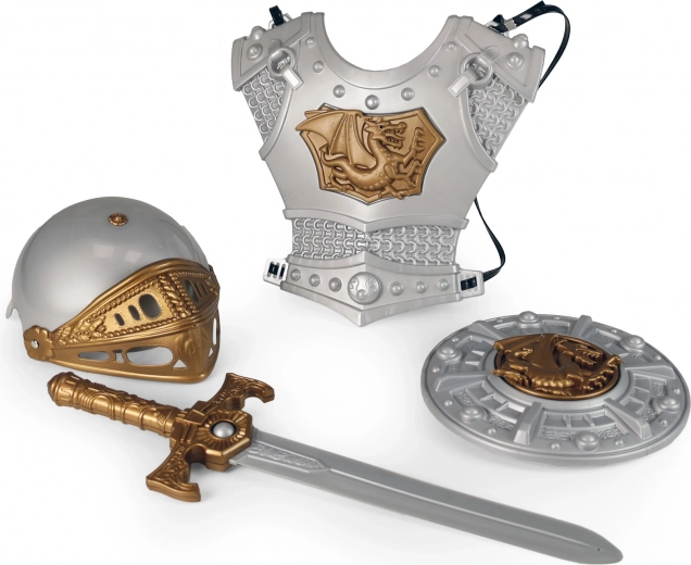 Helm, Rüstung, Schwert und Schild bilden ein stimmiges Set, mit dem das Kind für jedes Abenteuer gerüstet ist – vom Karneval bis zu häuslichen Schlachten.