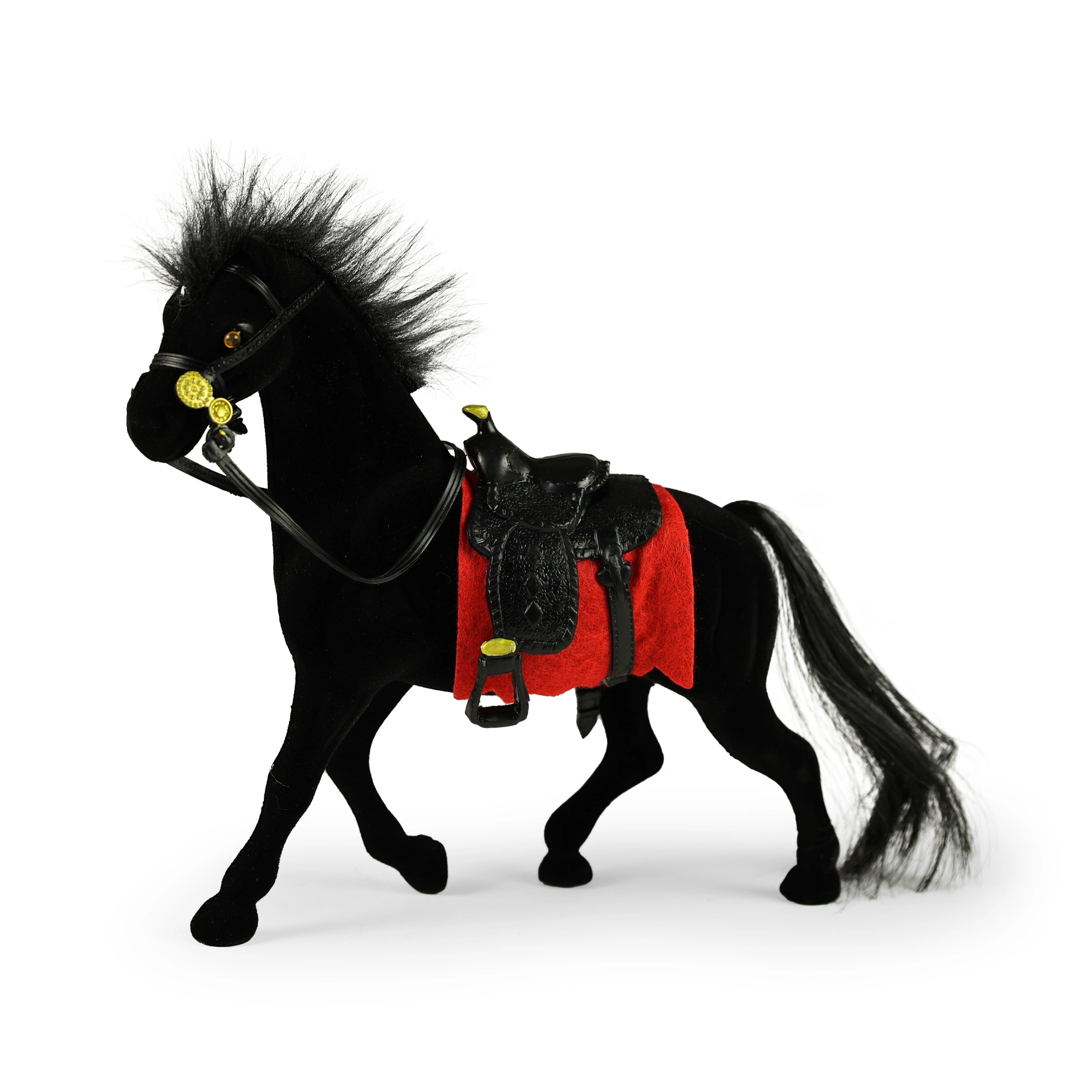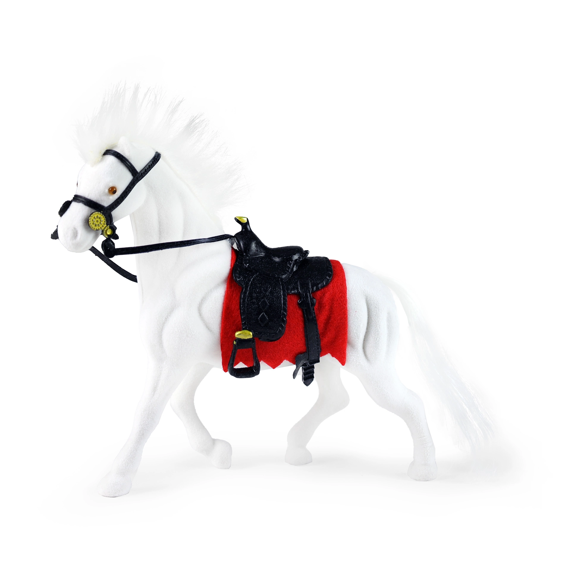 Das Pferd ist mit Sattel und Trense ausgestattet, sodass Kinder echte Reiter spielen und eigene Geschichten erfinden können.