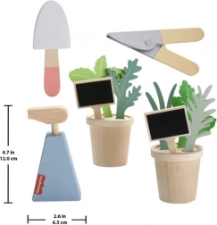 Das Holzgarten-Set für Kinder enthält 12 Teile, darunter: 2 Blumentöpfe mit Holzblättern und Pflanzen, einen Spiel-Löffel, eine Spiel-Schere, eine Sprühflasche und 2 Tafeln zum Beschriften von Pflanzen. Das Produkt ist aus FSC-zertifiziertem Holz (FSC-N004566) hergestellt und mit ungiftigen, wasserbasierten Farben verziert.