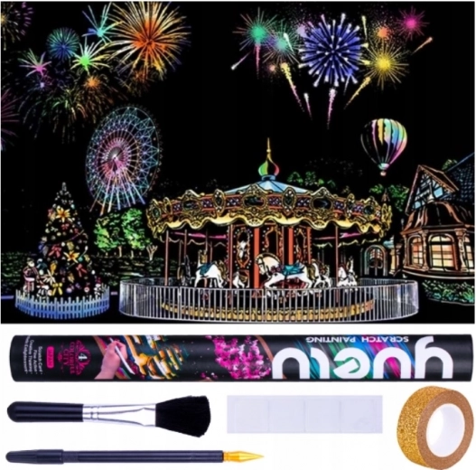 Entdecken Sie die Magie des Vergnügungsparks in der Gemütlichkeit Ihres Zuhauses mit unserem Kratzerbild. Dieses kreative Produkt bietet: