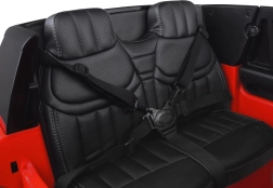Der Innenraum überzeugt mit einem gepolsterten Sitz aus Ökoleder, 5-Punkt-Gurten und einem übersichtlichen Armaturenbrett mit Wählhebel für Vorwärts-/Rückwärtsfahrt und Schalter für den Antrieb 2x4/4x4. Das farbige Multimedia-Display spielt Lieder und Videos (MP4) von USB oder SD-Karte ab; Bluetooth, Radio und Touch-Steuerung sind ebenfalls vorhanden.