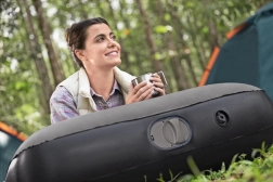 Die integrierte USB 5V/2A-Pumpe bläst die Matratze in etwa 3 Minuten auf; zusätzlich ist das Aufpumpen mit einer Handpumpe möglich. Das integrierte Kissen erhöht den Komfort, im entleerten Zustand ist die Matratze kompakt und lässt sich leicht transportieren und verstauen – ideal fürs Camping, das Gästezimmer oder als temporäres Bett.