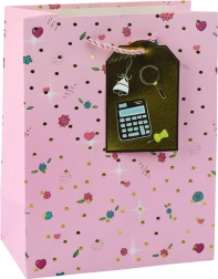 Diese Geschenktasche vereint elegantes Design und praktische Robustheit. Zarte Punkte, Blumen- und Blattmuster werden durch glänzende goldene Details und ein beiliegendes Kärtchen mit Motiven wie Bücher, Taschenrechner oder Malpalette ergänzt. Mit den Maßen 32 × 26 × 12 cm bietet sie Platz für kleine bis mittelgroße Geschenke.