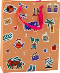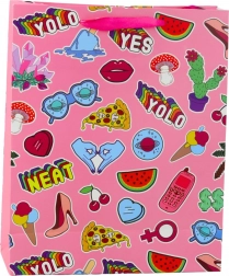 Eine stylische Geschenktasche mit Aufklebermotiv und kräftigen Farben verleiht jedem Geschenk eine moderne und verspielte Note. Hergestellt aus robustem Zierkarton und ergänzt durch stabile Kordelgriffe für bequemes Tragen. Ideal für Geburtstage, Treffen mit Freunden und Geschenke für Teenager.