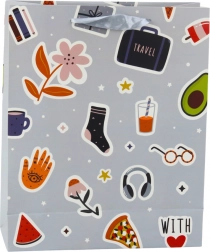 Die originelle Geschenktasche mit einem Print aus bunten Aufklebern und trendigen Schriftzügen fällt sofort ins Auge. Kräftige Farben und ein modisches Design machen sie zum perfekten Begleiter für Geschenke an Jugendliche und Erwachsene. Dank der Maße 32 × 26 × 12 cm eignet sie sich bequem für kleine bis mittelgroße Präsente.