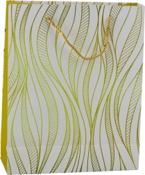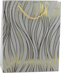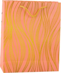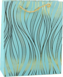 Diese stilvolle Geschenktasche besticht durch ein elegantes goldenes Wellenmotiv auf farbigem Untergrund und eine robuste Konstruktion, die auch schwerere Überraschungen sicher trägt. Farblich abgestimmte Kordelgriffe gewährleisten einen komfortablen und sicheren Transport.