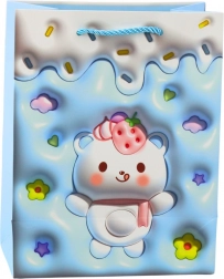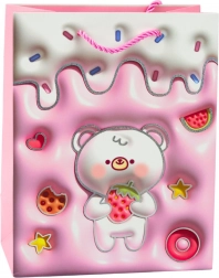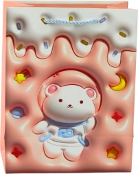 Diese Geschenktasche aus Zierkarton begeistert mit einer Pastellpalette in Rosa, Blau, Orange und Lila. Der niedliche Bär mit Sternchen und Fruchtdetails erzeugt einen 3D-Effekt, als würde er aus der Tasche hervortreten. Abgerundet wird der stilvolle Look durch farblich abgestimmte Kordelgriffe für bequemes und sicheres Tragen.