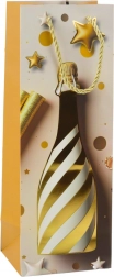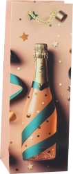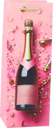 Verleihen Sie Ihrem Geschenk Pfiff und eine sichere Verpackung. Diese Flaschentasche in pastelligen Tönen von Rosa, Beige, Gold und Blau besticht durch einen modernen, festlichen Look mit Champagnerflasche, Sternchen und Konfetti. Der robuste Zierkarton trägt zuverlässig auch schwerere Flaschen, und der geflochtene goldene Griff sorgt für bequemes Tragen.