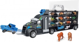 Entdecken Sie den multifunktionalen Laster, der zugleich praktischer Koffer und unterhaltsame Abschussstation ist. Die zweiseitige Ladefläche mit transparentem Deckel fasst insgesamt 24 Figuren oder Autos, sodass alles seinen Platz hat und nichts verloren geht. Das Set umfasst 6 Dinosaurier, 6 Tiere, ein kleines Auto und einen Hubschrauber – alles sofort spielbereit.