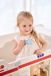 Der große Holz-Krankenwagen von VIGA verwandelt das Kinderzimmer in ein Rettungszentrum. Kinder können Plüschpatienten versorgen, die Leitstelle anrufen und zu Einsätzen ausrücken. Dank der umfangreichen Ausstattung – vom Stethoskop über den AED bis zur Trage – erleben sie reale Situationen sicher nach und eignen sich Grundlagen der Ersten Hilfe an.