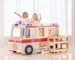 Kinder fahren, versorgen und disponieren – alles in einem robusten Holzfahrzeug mit vielen interaktiven Elementen, die ins Spiel hineinziehen.