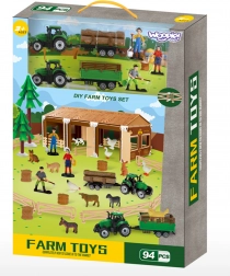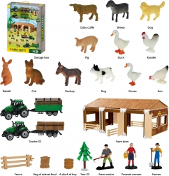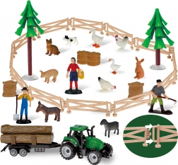 Das Komplettset umfasst Tiere, drei Spielfiguren, zwei Traktoren mit abnehmbaren Anhängern, eine Scheune, Gehege und viele Zubehörteile – alles für den Bau des eigenen Bauernhofs.
