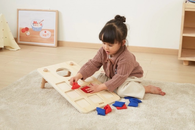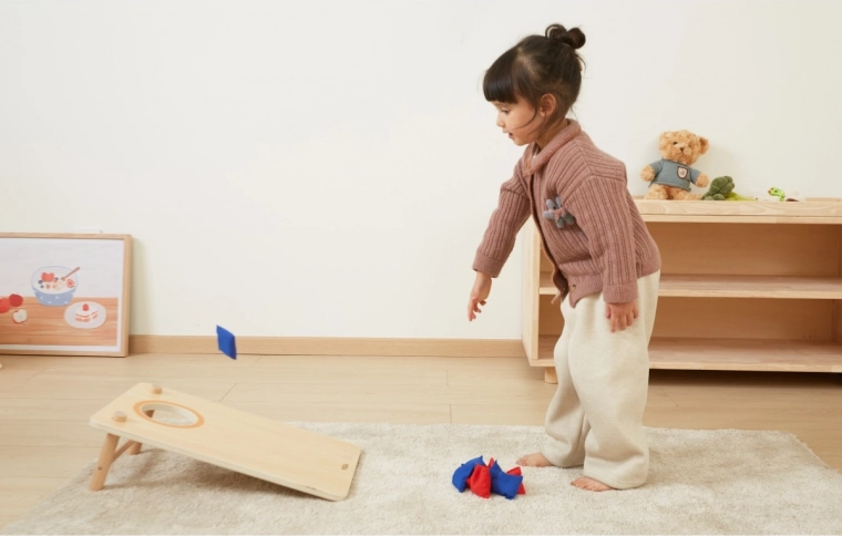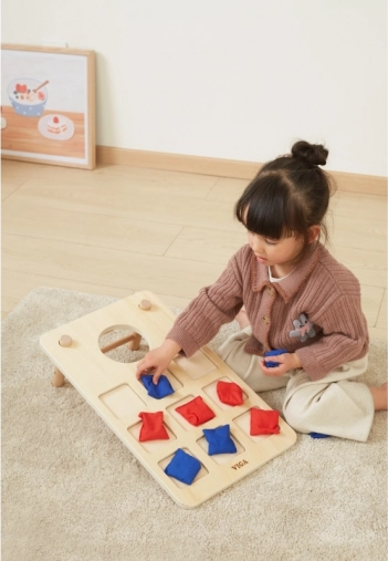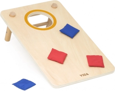Enthalten sind weiche Stoffbeutel in zwei Farben (rot und blau) zur einfachen Teamunterscheidung. Kinder trainieren beim Werfen Feinmotorik, Koordinationsfähigkeiten und Geduld, Erwachsene schätzen die schnellen Regeln und den flotten Wettbewerb.