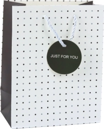 Elegante und vielseitige Geschenktasche mit Punkten und dem Aufdruck 'Just For You' bietet eine stilvolle Art, Geschenke für verschiedene Anlässe zu verpacken.