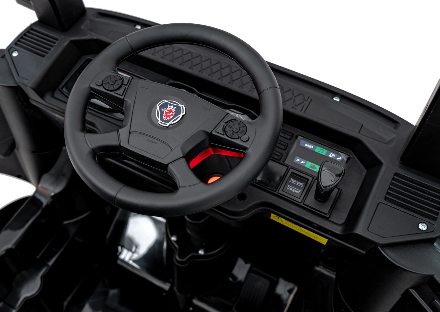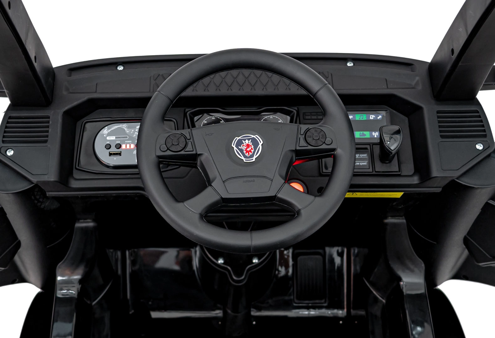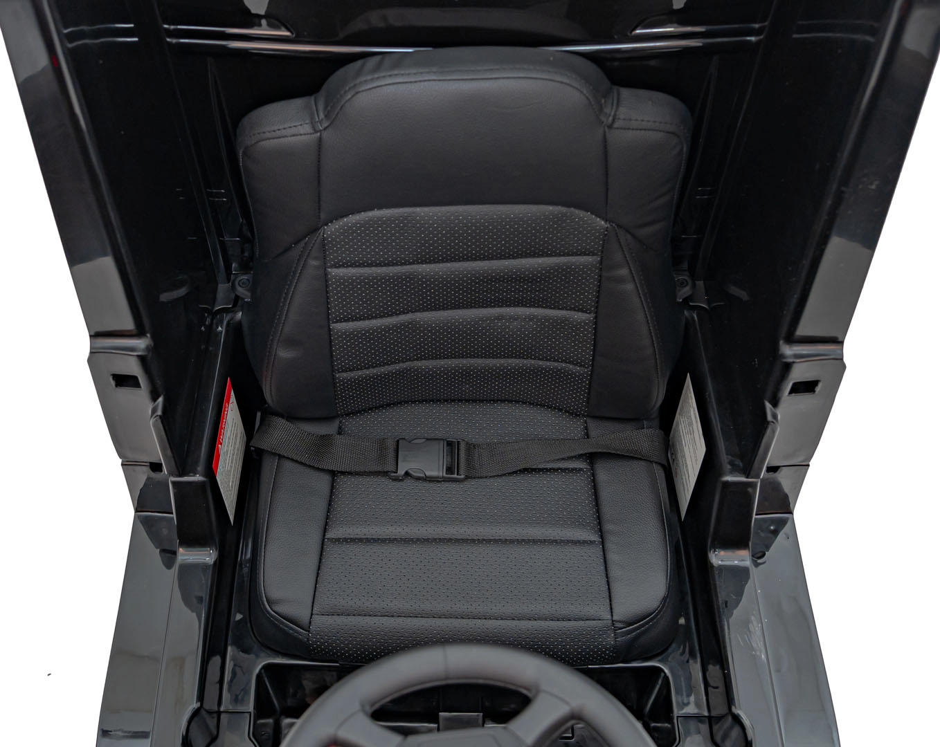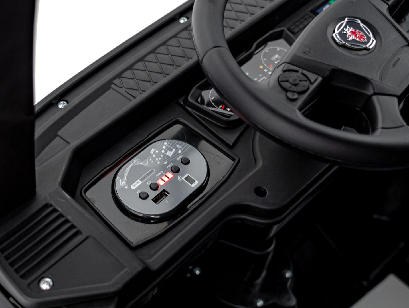 Der Sitz aus Eco‑Leder mit Sicherheitsgurt, das Audio-Panel mit MP3/USB/Bluetooth und die Soundtasten am Lenkrad sorgen für Komfort und Spaß.