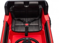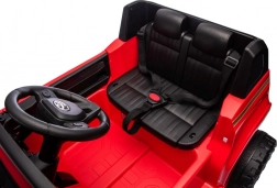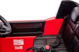 Der Innenraum überzeugt mit einem bequemen Kunstledersitz mit Gurten, einem funktionsfähigen Audio-Panel (Bluetooth, USB, MP3), vorderen LED-Scheinwerfern und Bedienelementen am Lenkrad (Hupe, Sounds). Für Sicherheit sorgt die 2,4-GHz-Fernbedienung mit drei Geschwindigkeiten und Not-Stopp.