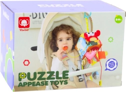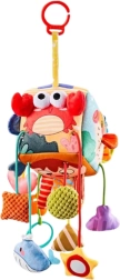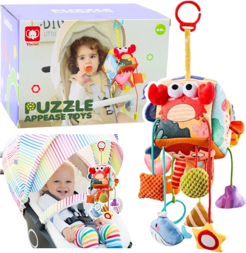 Die am Würfel befestigten Anhänger haben verschiedene Funktionen. Einige rascheln oder klingeln, während andere gedehnt und gedrückt werden können. Alle Teile des Spielzeugs fördern das Kind zur Interaktion und eigenständigen Erkundung.
