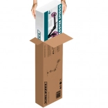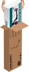 Roller, Ständer, Flaschenhalter, Klingel, Gurt, Ersatz‑Antirutsch‑Aufkleber, Schraubendreher, Anleitung, bunte Box, brauner Versandkarton