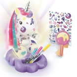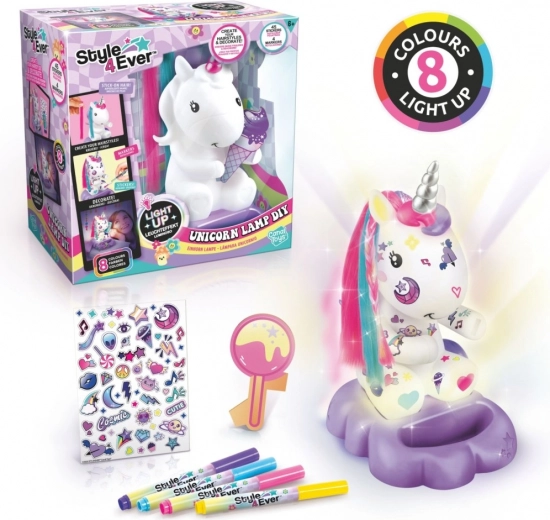 Im Set enthalten sind eine leuchtende Einhornfigur auf einem Sockel, 4 farbige Filzstifte zum Bemalen und Verzieren, Aufkleber sowie anklippbare, farbige Haarsträhnen für einen einzigartigen Look. Die Lampe leuchtet in 8 Farben und schafft so im Handumdrehen eine gemütliche Atmosphäre zum Lesen, Einschlafen oder Spielen. Dank der einfachen Anleitung ist das Basteln leicht und macht Spaß.