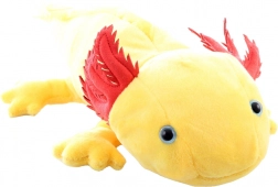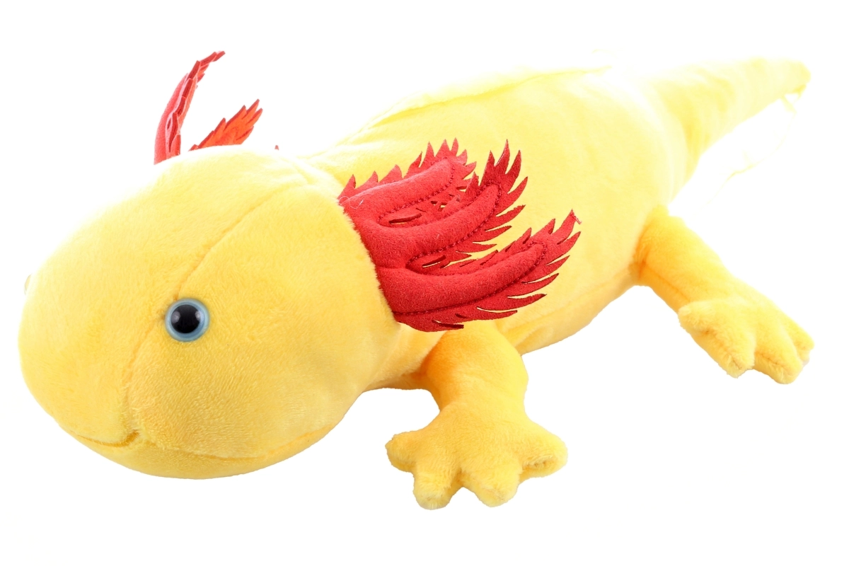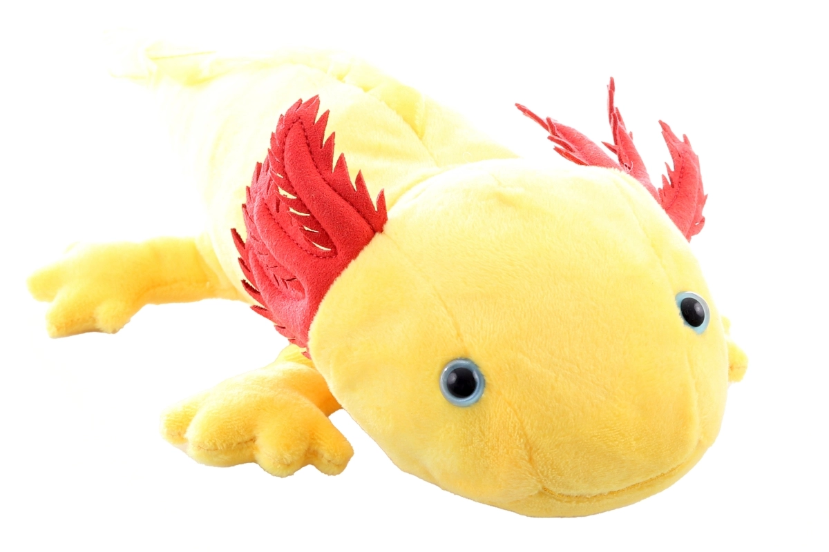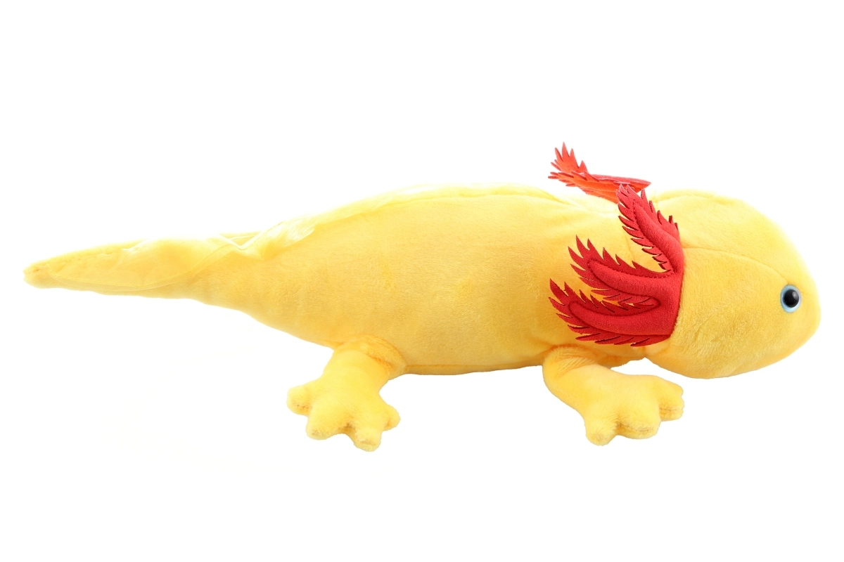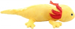 Gelber Körper mit roten äußeren Kiemen und sorgfältig verarbeiteten Nähten machen den Axolotl zur bezaubernden Deko und Spielgefährten.