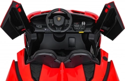 Der realistische Look wird durch aufklappbare Scherentüren, funktionale LED-Leuchten, sportliche Details und den zweisitzigen Sitz aus Eco-Leder mit Sicherheitsgurten unterstrichen. Die Bedienung ist im Cockpit intuitiv (Lenkrad, Pedal); das Fahrzeug kann außerdem vollständig mit der 2,4-GHz-Elternfernbedienung samt STOP-Taste für sofortiges Anhalten gesteuert werden.
