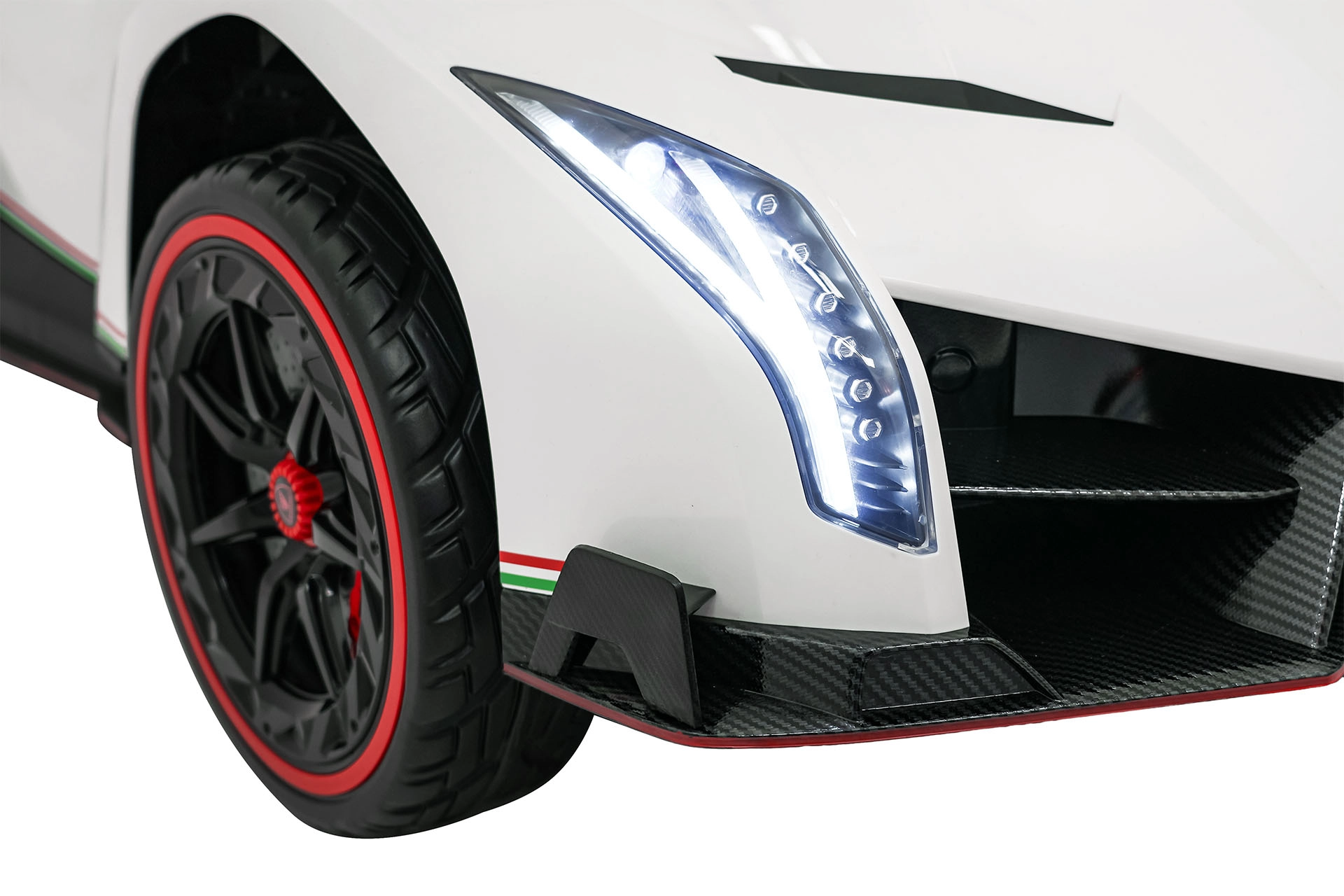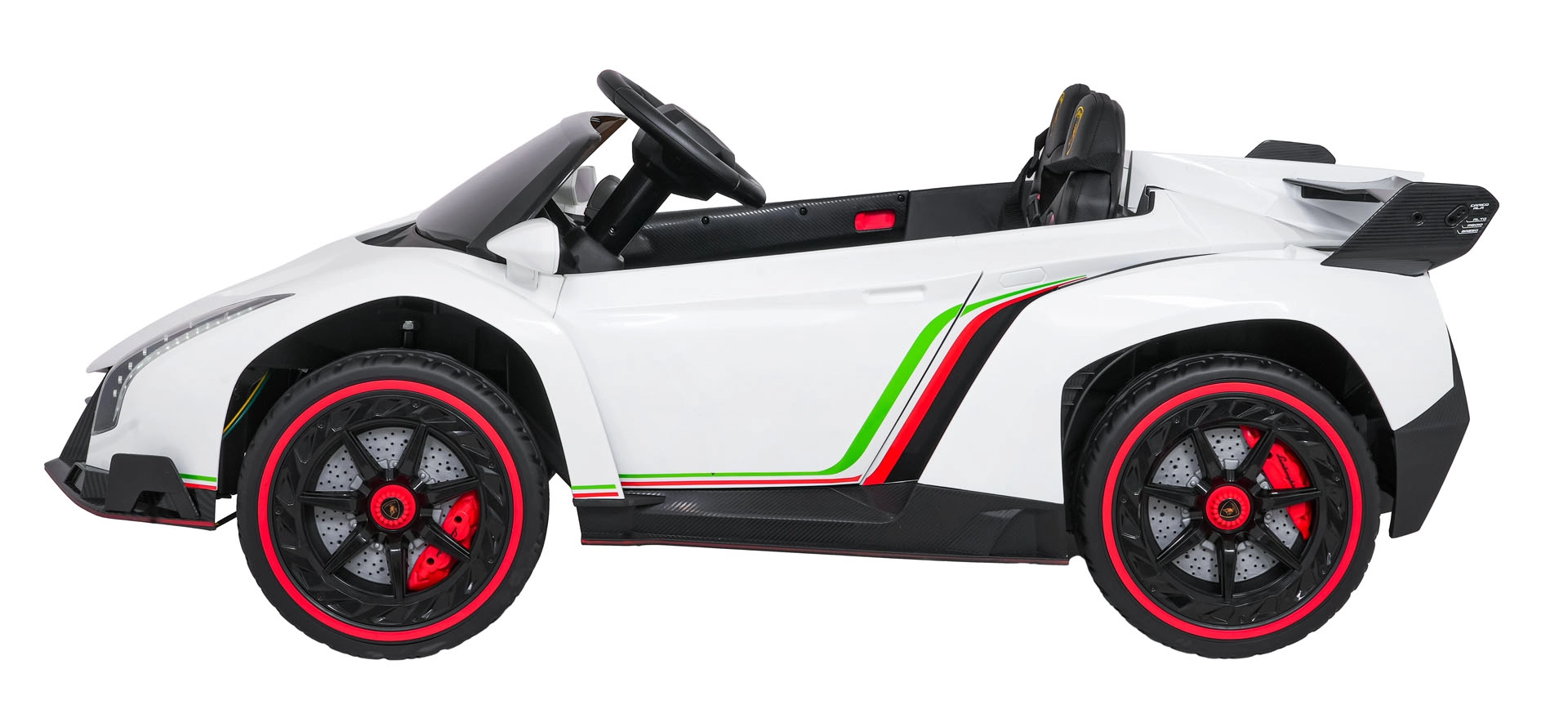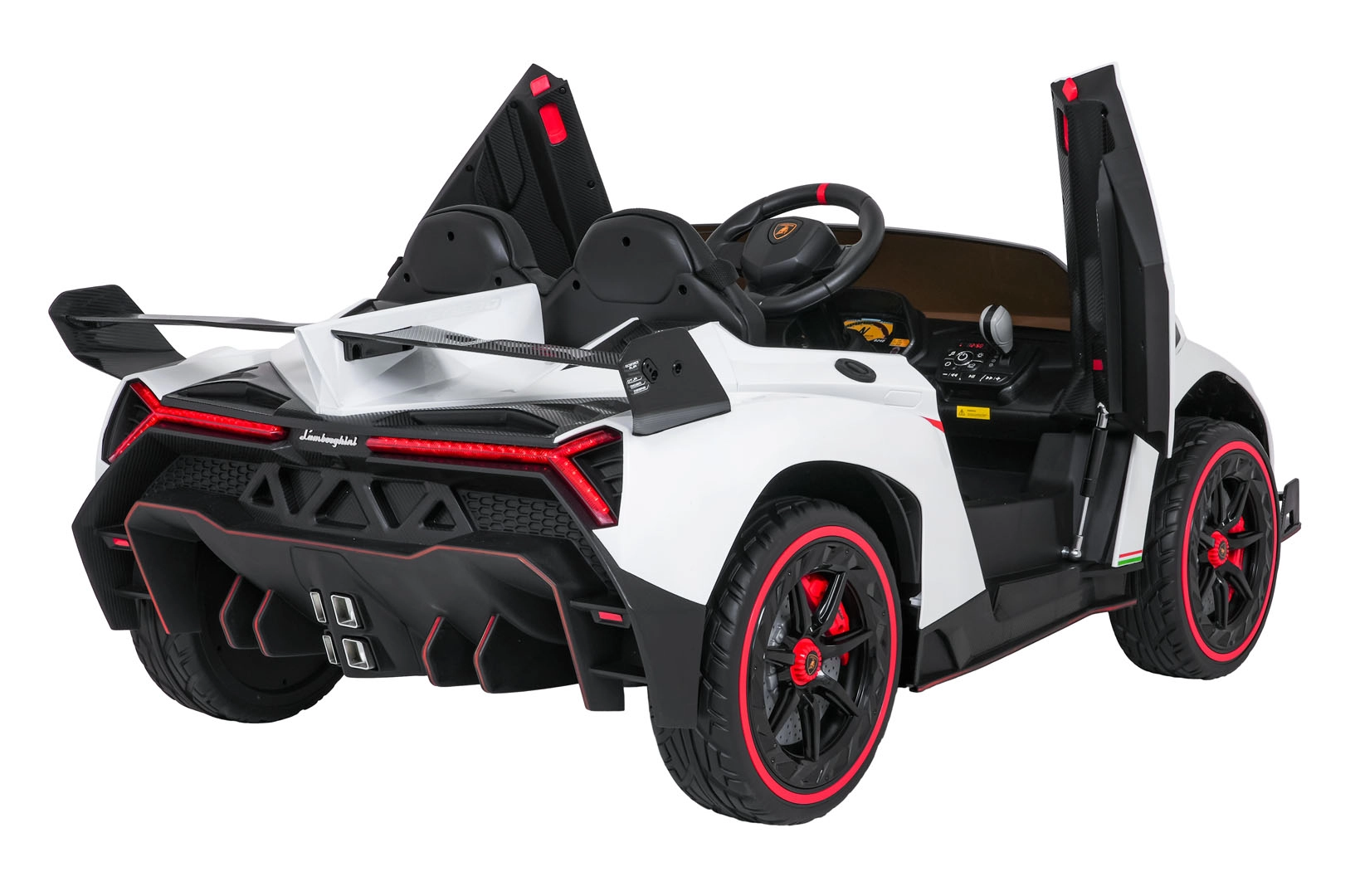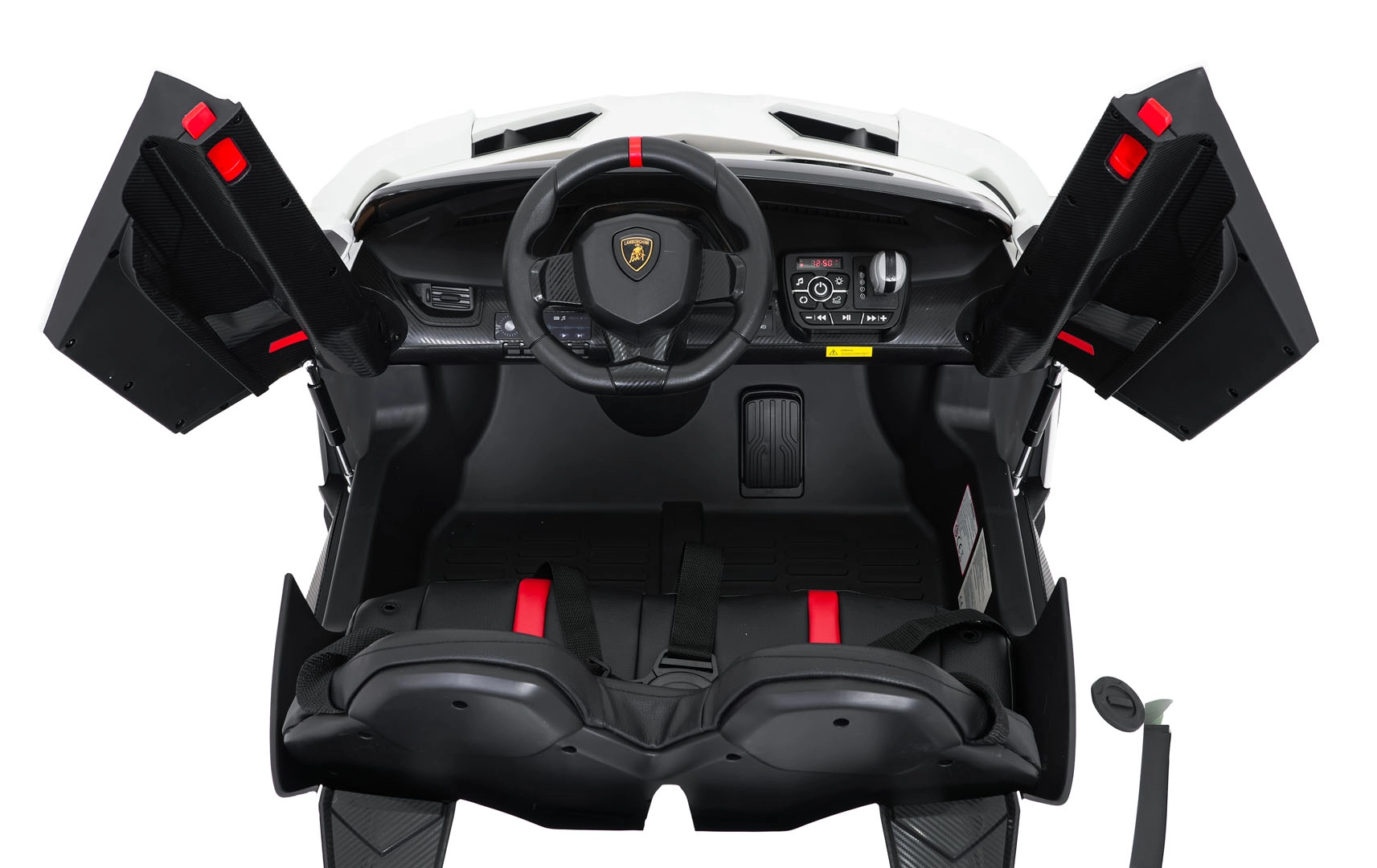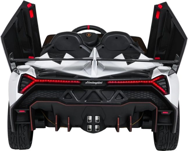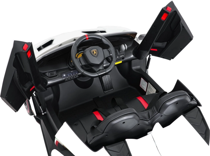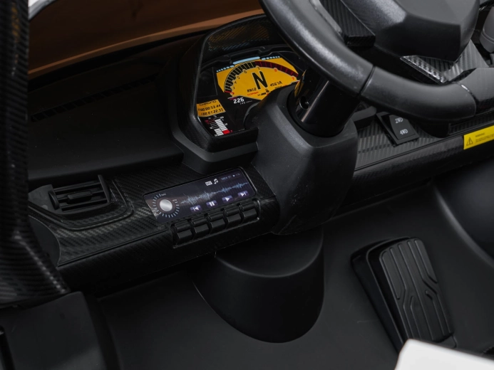 Der realistische Look wird durch aufklappbare Scherentüren, funktionale LED-Leuchten, sportliche Details und den zweisitzigen Sitz aus Eco-Leder mit Sicherheitsgurten unterstrichen. Die Bedienung ist im Cockpit intuitiv (Lenkrad, Pedal); das Fahrzeug kann außerdem vollständig mit der 2,4-GHz-Elternfernbedienung samt STOP-Taste für sofortiges Anhalten gesteuert werden.
