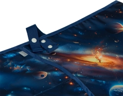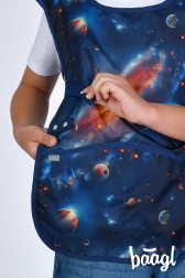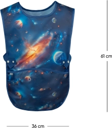 Praktische Doppeltaschen im unteren Bereich fassen Pinsel, Stifte und kleine Werkzeuge. Dank des bequemen seitlichen Verschlusses sitzt die Schürze gut und schränkt die Bewegung nicht ein. Das moderne Weltraumdesign motiviert Kinder zum Kreativsein.