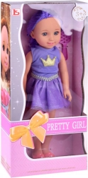 Die Puppe ist in einem stilvollen lila Kleid mit Kronenmotiv gekleidet, das ihr königliches Aussehen betont.