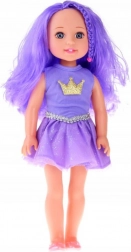 Die Puppe ist in einem lila Kleid mit einem funkelnden Krönchen auf der Brust und einem feinen silbernen Gürtel gekleidet, was ihr ein königliches Aussehen verleiht. Ihre rosa Ballerinas runden das Outfit perfekt ab. Dank der beweglichen Arme und Beine kann die Puppe in verschiedene Positionen gebracht werden, was Kindern Raum zur Erstellung eigener Geschichten bietet. Aus robustem Kunststoff gefertigt, ist sie bereit für tägliches, intensives Spielen.