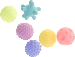 Das Set beinhaltet sechs Bälle mit unterschiedlichen Strukturen: kleine und große Erhebungen, Vertiefungen, Streifen und Igel mit Stacheln. Lehrt Koordination, das Erkennen von Farben und Formen und bietet eine entspannende Massage, die beruhigt und das Kind auf den Schlaf vorbereitet.