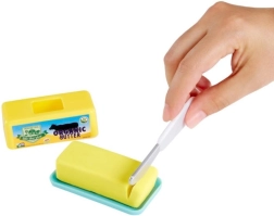 Ein realistisches Butterstück auf einem Teller mit Deckel und Kindermesser hilft, die Feinmotorik zu trainieren und das Zubereiten von Speisen nachzuahmen.