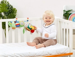 Textilschlaufen befestigen das Spielzeug am Bettchen, Kinderwagen oder Autositz – der ideale Begleiter zu Hause und auf Ausflügen.
