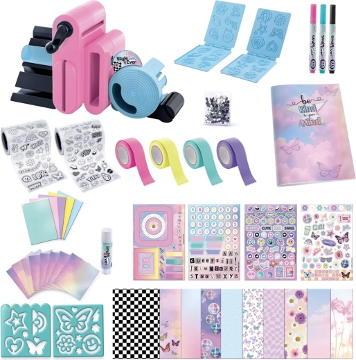 Enthalten sind mehr als 150 Zubehörteile: Papierbögen, schwarz-weiße und farbige Aufkleber, Marker, Glitzerkleber, dekorative Tapes und thematische Schablonen mit Motiven wie Blumen, Schmetterlingen, Sternen und Schriftzügen wie „Be Happy“ oder „Cool“. Im Set finden Sie außerdem ein kleines Notizbuch für die sofortige Verwendung der neu gestalteten Dekorationen.