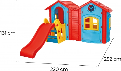 Entdecken Sie einen kompakten und sicheren Kinderspielplatz, der Ihren Garten oder das Kinderzimmer in eine Abenteuerzone verwandelt. Zwei Häuschen mit öffnenden Türen und Fenstern laden zum Versteckspiel ein, während die sanfte Rutsche mit einer Länge von 123 cm für jede Menge Freude sorgt. Das Material mit UV-Schutz behält seine Farben und Widerstandsfähigkeit gegenüber Witterungseinflüssen langfristig bei.