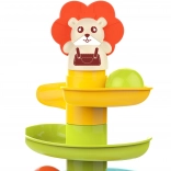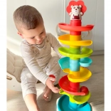 Bauen Sie den farbenfrohen Spiral-Turm und beobachten Sie, wie die Kugeln Ebene für Ebene nach unten rollen. Die Teile der Kugelbahn lassen sich leicht zusammenklicken, sodass Kinder immer wieder neu bauen, Geduld üben und kreativ werden können. Jede der 6 bunten Kugeln rasselt angenehm in Bewegung, regt die Sinne an und verlängert die Spielzeit.